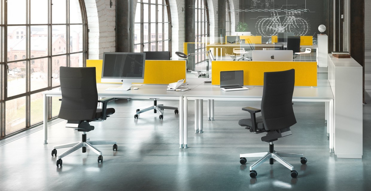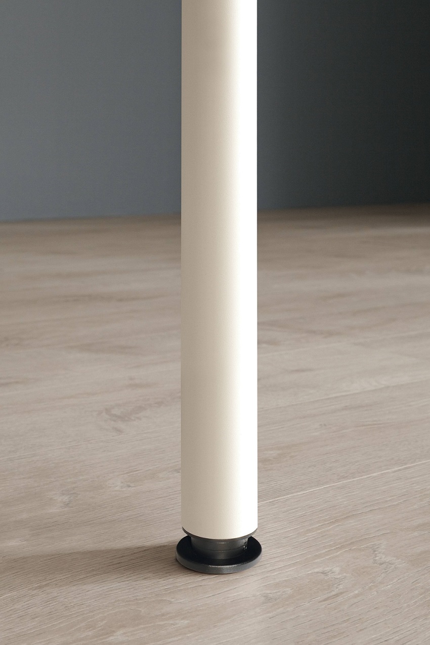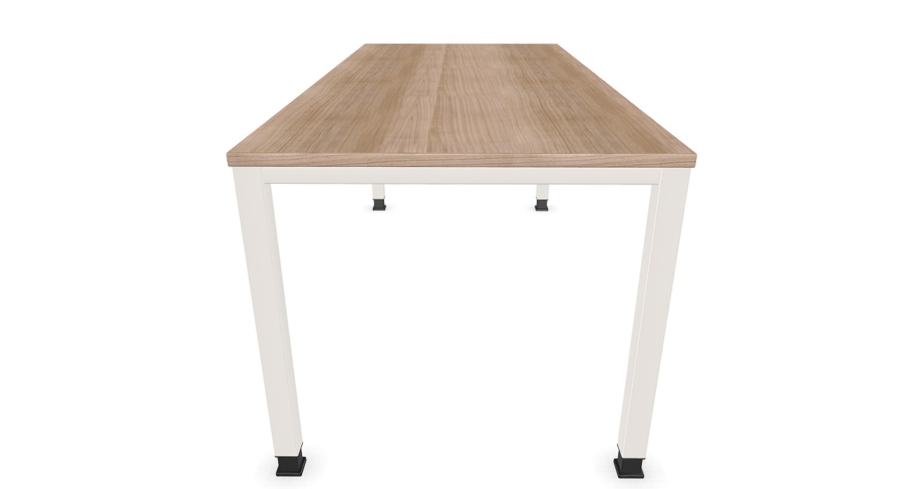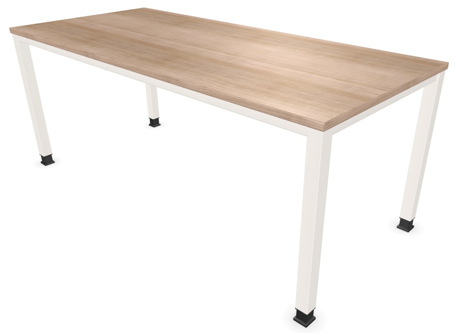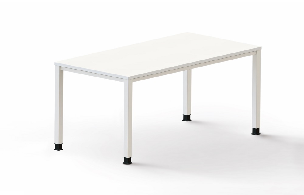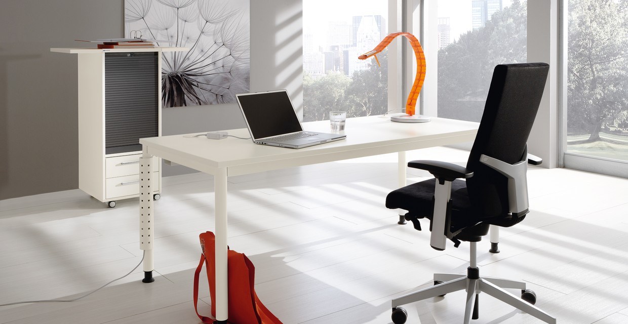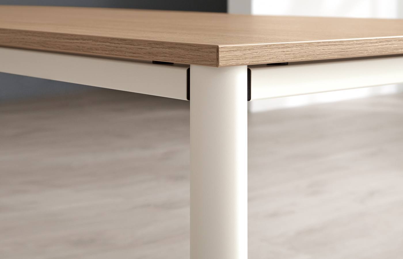 Das verschraubte 4-Fuß-Schreibtischprogramm Sinac von Palmberg besteht aus einem sichtbaren, umlaufendem Holmprofil in den Maßen 30 x 30 mm, an dem entweder quadratische oder runde höhenverstellbare Tischsäulen montiert werden.