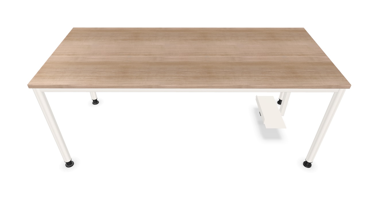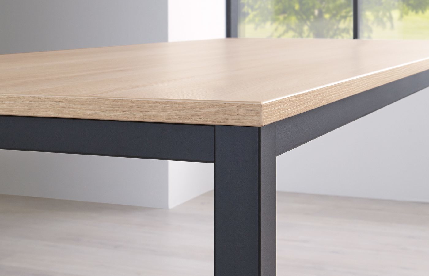 Die 25 mm starke Tischplatte aus Gütespanplatten hat eine melaminharzbeschichtete Oberfläche. Als umlaufende Sicherheitskante wird ein 3 mm PP-Umleimer verwendet.